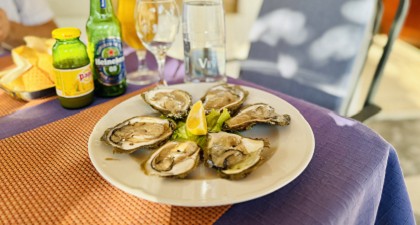 當地盛產的藍寶石牡蠣,搭配烤魚料理,品嚐一口,鮮味十足。
