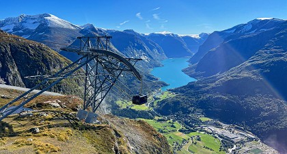 在甲板上欣賞峽灣兩岸都是堅硬、陡峭的岩層,您可尋找七條相鄰又分流所的七姐妹瀑布,還有一條小的叫新娘面紗,欣賞沿途欣賞高山積雪和萬瀑奔流的景觀雪景,此段航程號稱蓋朗格峽灣最美的一段景色。羅恩天空纜車,高度1011米,2017年更被評比為全世界前10名最佳纜車,山頂設置有觀景台和景觀餐廳,可俯瞰峽灣,美景盡收眼底。